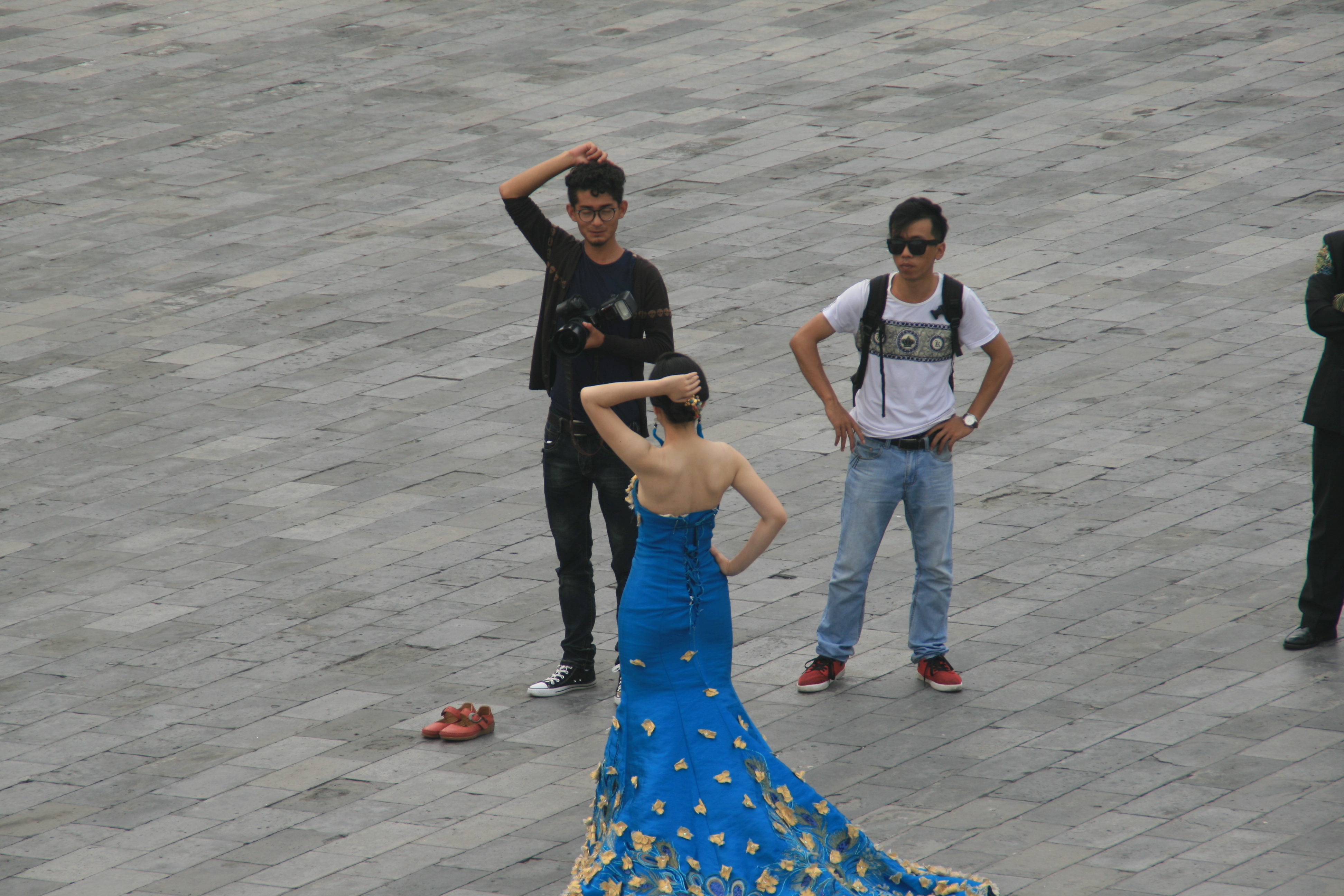 Braut in Blau erhält Posing Anweisungen