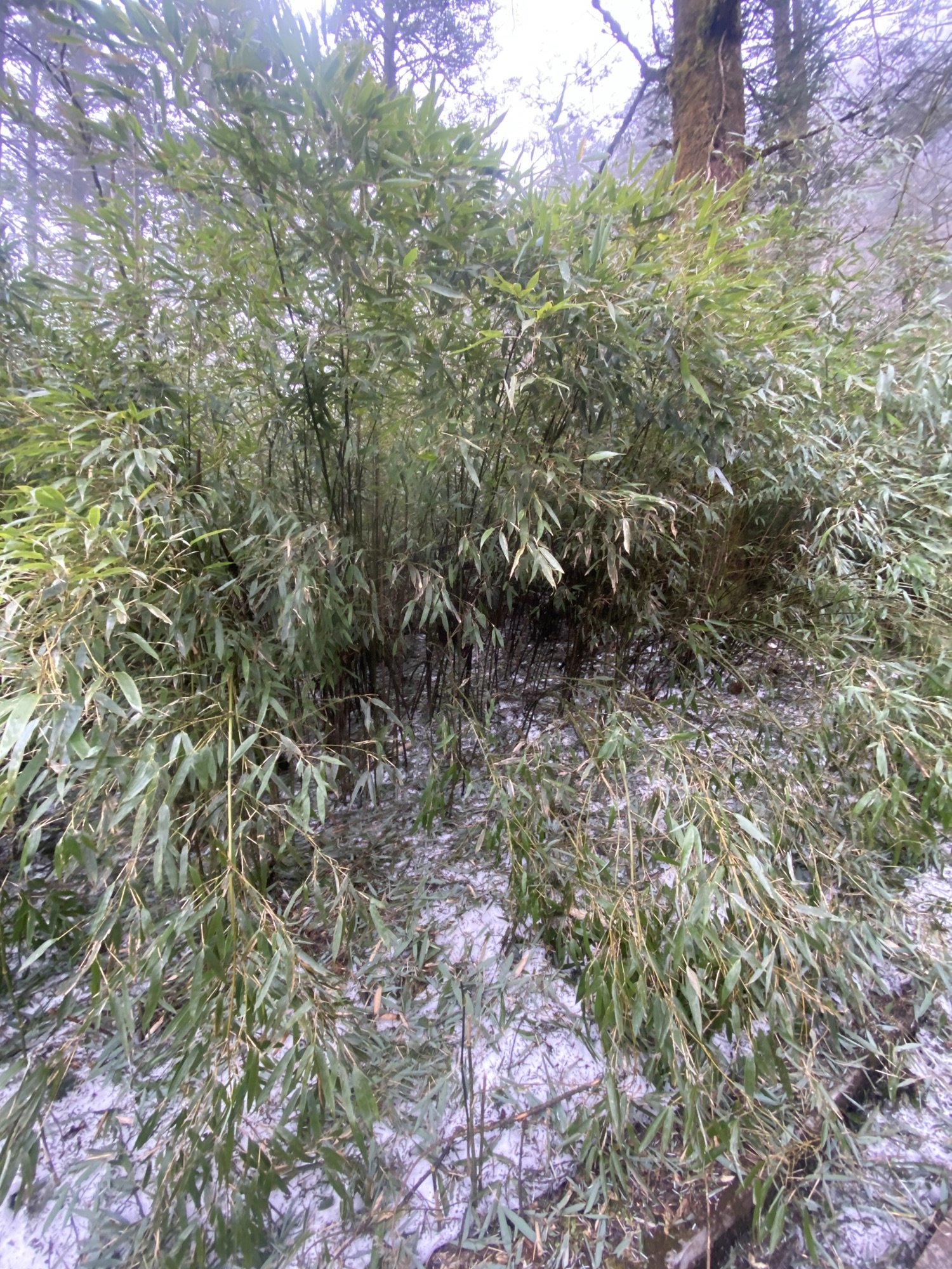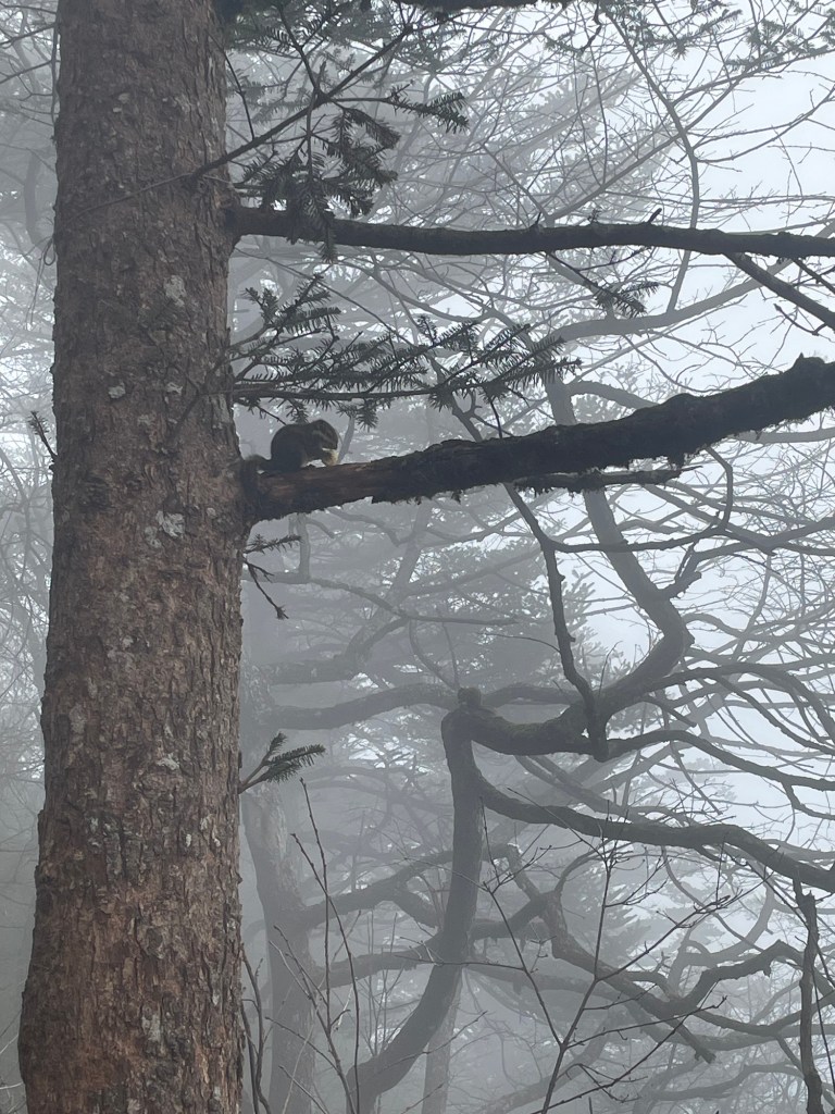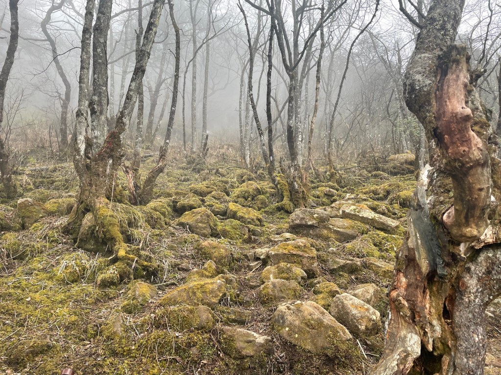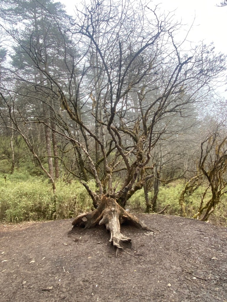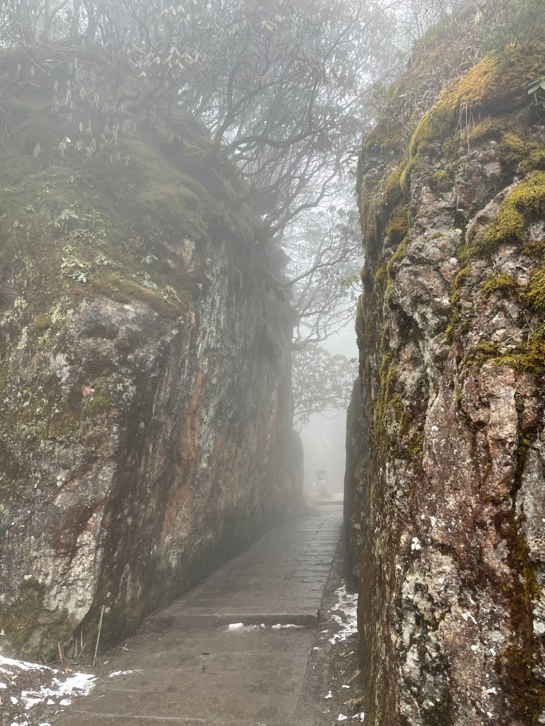 Ab hier wurde es voll. Denn hier halten die Busse, die die Touristen den Berg hochfahren. Ein paar letzte Stufen müssen dann alle bewältigen. Der Weg war gesäumt von Essensständen, bis er nach ca. 1,5 km zur Talstation der Gondel zum Gipfel führte. Alternativ: weitere 6 km Treppen. Wir entschieden, dass wir jetzt schon so weit gekommen waren, dass wir diese letzten 6 km auch noch schaffen. Aber zugegebenermaßen fluchten wir unterwegs dennoch über jeden weiteren steilen Anstieg. Die mit Flechten überwucherten knorrigen Bäume am Wegesrand und aus Schluchten aufsteigende Wolkenstrudel entschädigten uns.