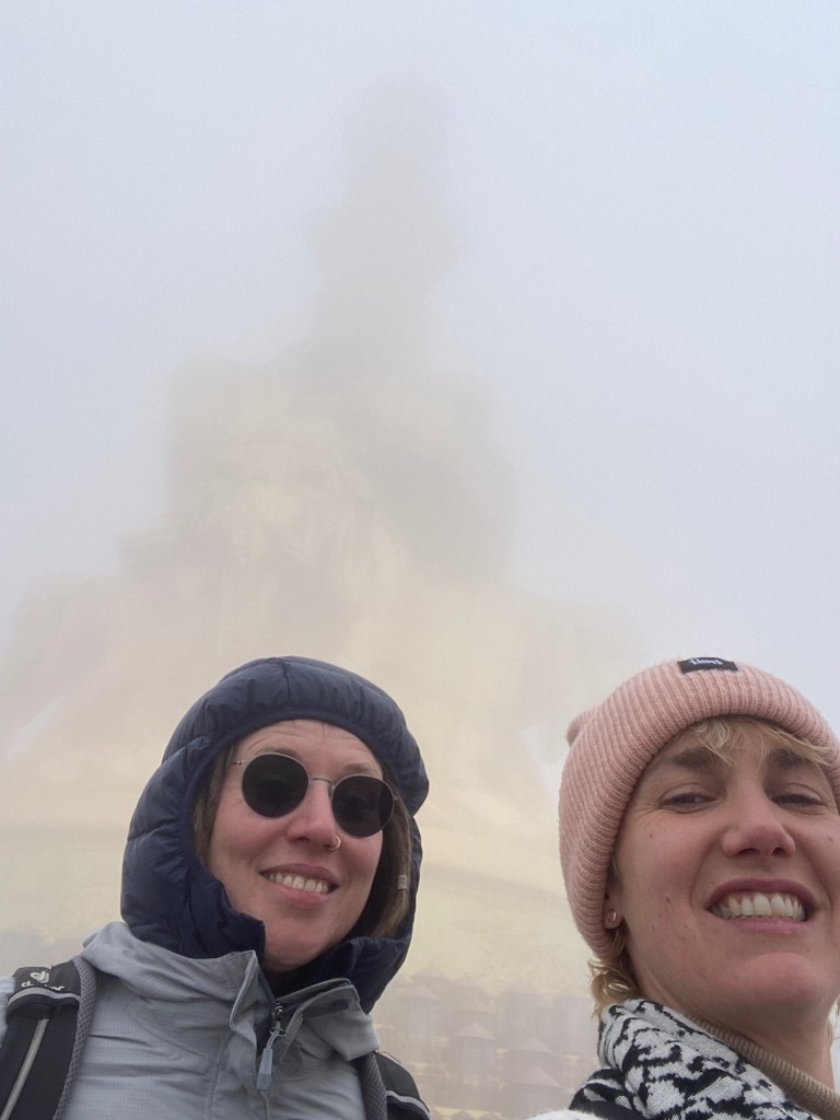Gestärkt machten wir uns auf zum goldenen Dach und sahen… nichts. Die Wolkendecke war so dicht, dass wir es nicht wagten uns auch nur für kurze Zeit zu trennen auf die Gefahr hin uns in der Suppe zu verlieren. Wie durch ein Wunder riss eine Wolke für wenige Sekunden auf, so dass wir zumindest einmal die riesige goldene Statue in Gänze sehen konnte. Dann war sie sofort wieder weg.