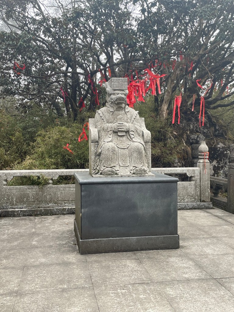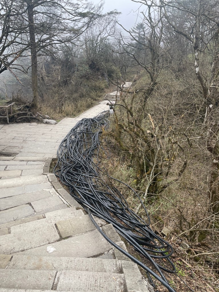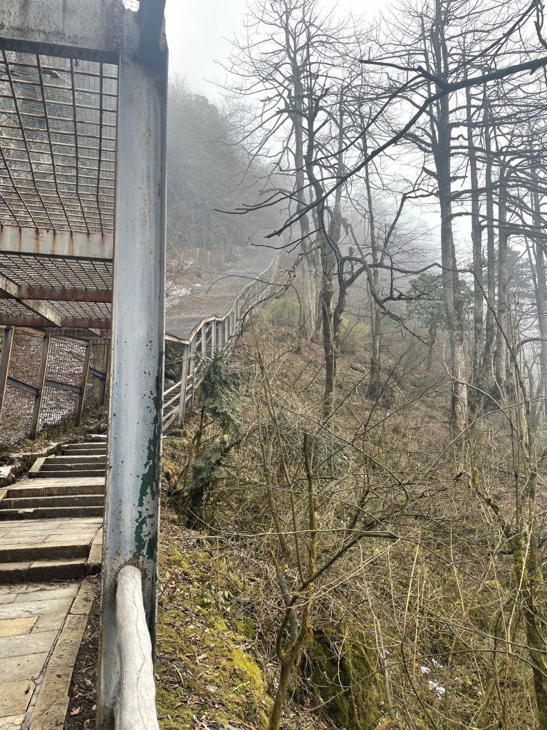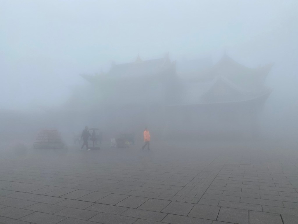 Punkt 8:00 erklommen wir die Stufen hinter dem Kloster, dem Weg weiter folgend. (Die Mädels, Xiaoxia und Tingting waren um vier schon losgelaufen, um den Sonnenaufgang oben sehen zu können – das war vermutlich auch der Plan der nachtwandernden Horden.) Die Wolken hingen tief, vom Panorama von gestern war nichts mehr zu sehen.