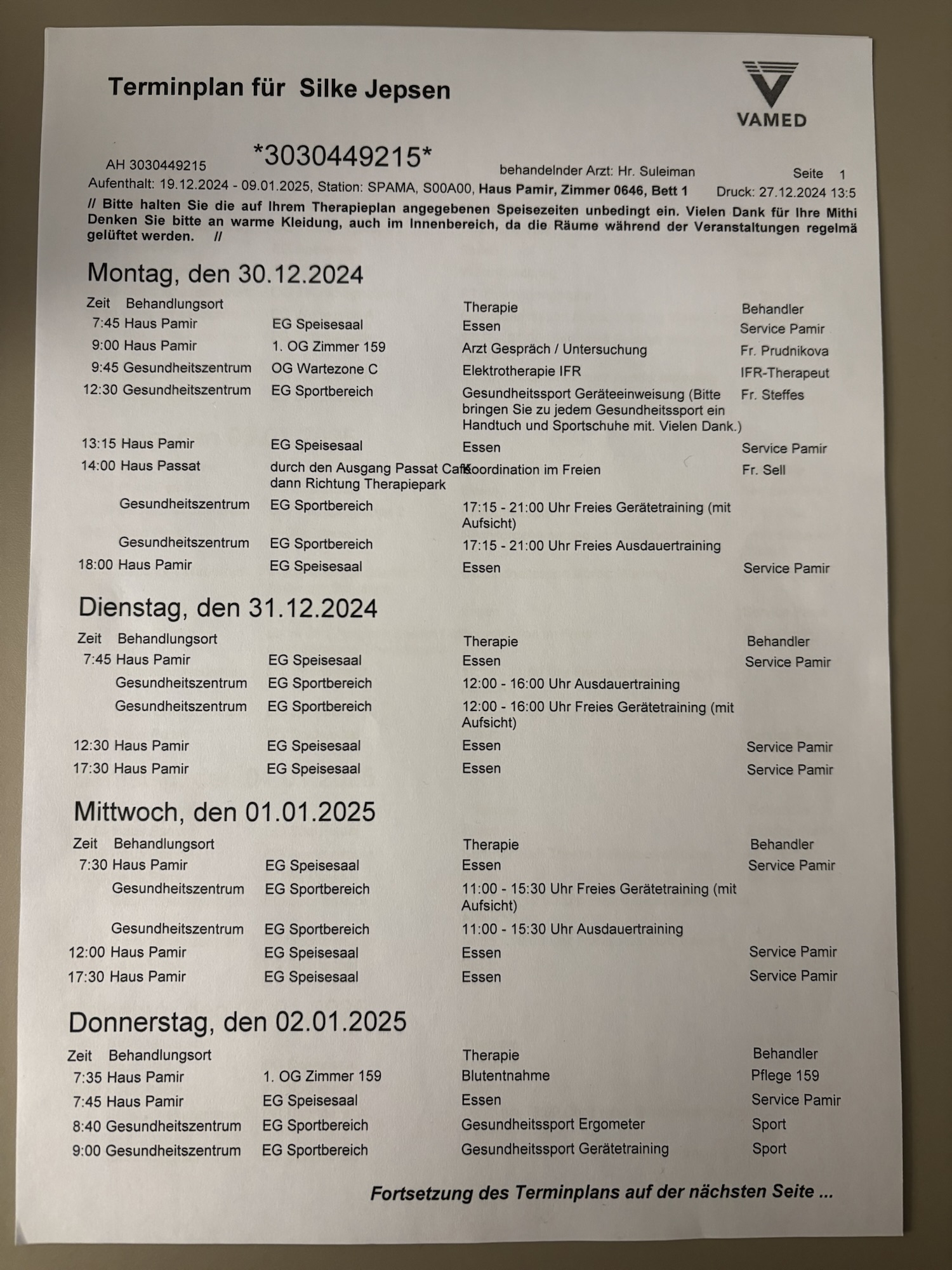 Die Feiertagssituation ist wirklich unglücklich. Ich fühle mich akut unterbeschäftigt. Das geht so weit, dass ich angefangen habe vom Puzzleverleih hier Gebrauch zu machen. Drei Puzzle mit je 1000 Teilen habe ich schon fertig gestellt – zwei davon jedoch zugegebenermaßen mit Jonas‘ Hilfe, der mich das Wochenende nach Weihnachten besucht hat. An den Feiertagen und am Wochenende bleibt mir meistens nur das freie Sportprogramm zu einem bestimmten Zeitslot. Also 20 Minuten Ergometer fahren und die freien Übungen, die ich von meiner Hamburger Physiotherapeutin bekommen habe. Ich bin wirklich so froh, dass die mich ausgestattet hat, sonst könnte ich mich auf Ergometer und freihändiges Aufstehen beschränken, wenn ich nur auf das zurückgriffe, was ich hier gelernt habe. Meinen Rückenkurs, in dem ich in der ersten Stunde freihändiges Aufstehen gelernt habe, hatte ich nämlich nie wieder. Ich habe aber von einem Mitinsassen (wir werden hier Rehablilitanten genannt, ich finde aber Insassen treffender) erfahren, dass der Kurs durchaus weiter ging und er dort auch weiter regelmäßig war. Wurde ich da rausgeschmissen, weil ich rumgemault hab, dass mir das Niveau zu niedrig ist? Die Therapeutin meinte, ich müsste eigentlich in einen weiter fortgeschrittenen Kurs, wenn ich mit meiner Physio schon Planks gemacht hätte. Nur habe ich jetzt halt gar keinen Kurs mehr – weder die Krabbelgruppe, noch den fortgeschrittenen Kurs. Aber morgen habe ich wieder einen Arzttermin, in dem ich sowas erfragen kann.