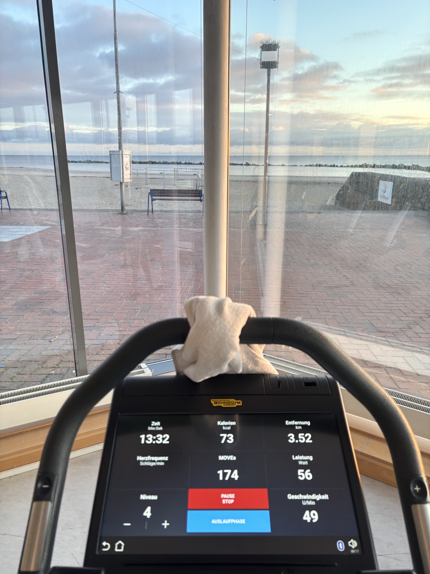Nachdem ich Weihnachten zu Hause verbracht hatte, war ich Silvester / Neujahr allein in Damp. Für Silvester hatte ich mir ein Wohlfühlprogramm vorgenommen: Erst Sport, danach in die Sauna und abends auswärts im Restaurant des Hotels raffinierteres Essen, als das obligatorische Käsebrot, das ich jeden Morgen und jeden Abend gegessen habe. Im örtlichen Restaurant Limerick bekam ich stattdessen Pilzcremesuppe und ein mit Ziegenkäse verfeinertes Risotto. Ja, auch wieder recht sahnelastig, das essen aber es gab für Vegetarier ohnehin schon nur dieses eine Gericht. Zumindest lecker war es. Mein Plan danach früh ins Bett zu gehen, scheiterte an dem doch überraschend vielen Geböller in dem gut hallenden Hof zwischen den hohen Beton-Klinikhäusern. Pünktlich um Mitternacht fing dann noch ein Mensch im Schottenrock an sehr schlecht auf einem Dudelsack zu spielen. Ich dachte kurz, mir sei was in den Tee gemischt worden. Das Geböller zog sich dann noch so bis ca. 2:00 Uhr aber ich musste ja trotzdem an Neujahr wieder bis spätestens 9:00 mein Frühstück beendet haben. Da ich aber den gesamten Tag außer eines weiteren Slots für freies Training absolut nichts zu tun hatte, ging ich nach dem Frühstück einfach nochmal ins Bett. Der Leerlauf an den Feiertagen gestaltete sich schon sehr zäh.