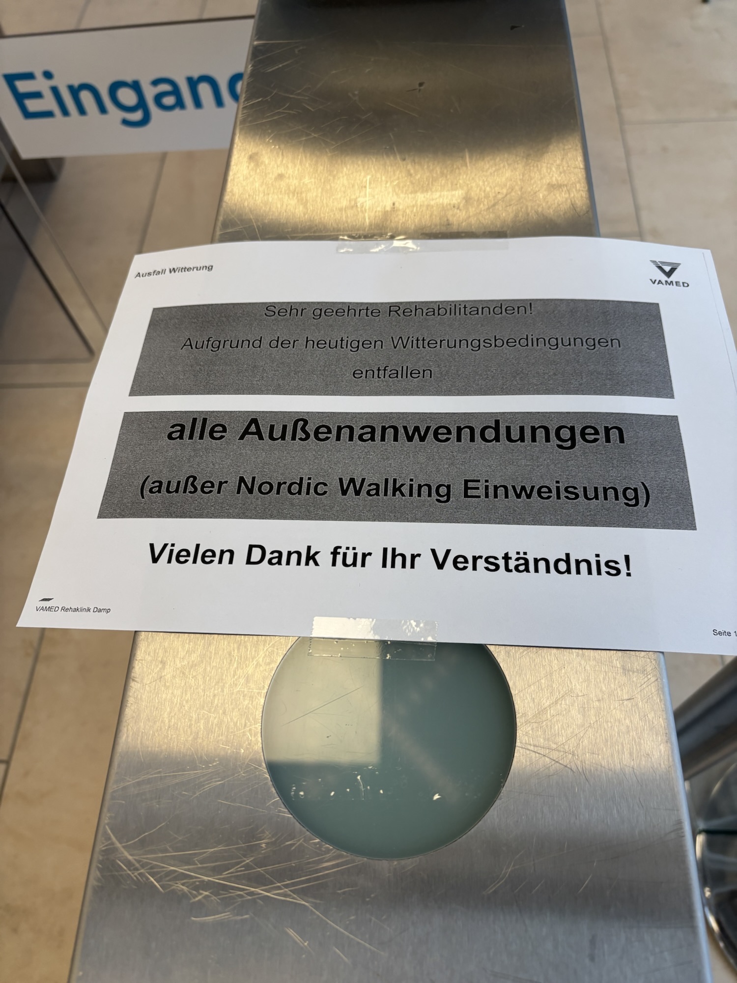 Nachdem ich mich einmal beschwert hatte, war mein Programm für die nicht-Feiertage allerdings ganz ordentlich gefüllt. Ich bekam eine gute Mischung aus Sport und Entspannungseinheiten sowie theoretischem Input zu – wie erwähnt – Ernährung, Stress, Motivation und resistenten Keimen. Am meisten profitiert habe ich vom Sportprogramm ergänzt durch das mehrmals tägliche Laufen in den sechsten Stock, wo sich mein Zimmer befand. Für das gesamte Haus standen genau zwei Fahrstühle plus ein nur manchmal funktionierender dritter Fahrstuhl zur Verfügung. Diese wurden gerade zu den Essenszeiten natürlich stark frequentiert vor allem von all den Insassen mit Gehbehinderung. Es dauerte also immer gefühlt eine Ewigkeit bis überhaupt mal ein Fahrstuhl anhielt und dann war dieser in der Regel rappelvoll. Ich war also nach zwei Versuchen konsequent auf Treppe umgestiegen.