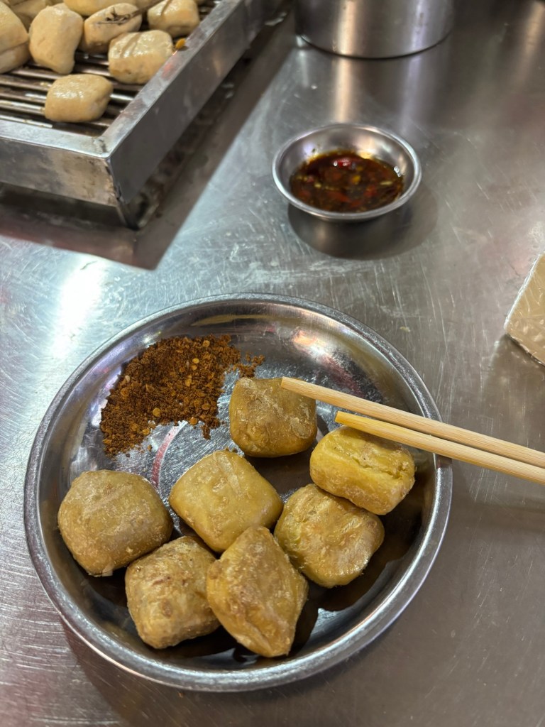 Die örtliche Spezialität will ich zum Abschluss nicht unerwähnt lassen, zumal sie zur Abwechslung vegetarisch ist. Tofu wird in Würfeln über Holzkohle auf dem Rost gegrillt und dann mit absurd scharfem Öl und nochmal zusätzlich scharfen Gewürzen verspeist. Der Tofu ist irgendeine Art von „stinky tofu“, den ich in Taiwan schon vermieden habe. Er stinkt aber nicht ganz so erbärmlich wie der in Taiwan. Ich habe todesmutig probiert. Vom stinky Aroma kommt unter der ganzen Schärfe nicht mehr viel zur Geltung, aber mein Lieblingsgericht wird es wohl dennoch nicht.