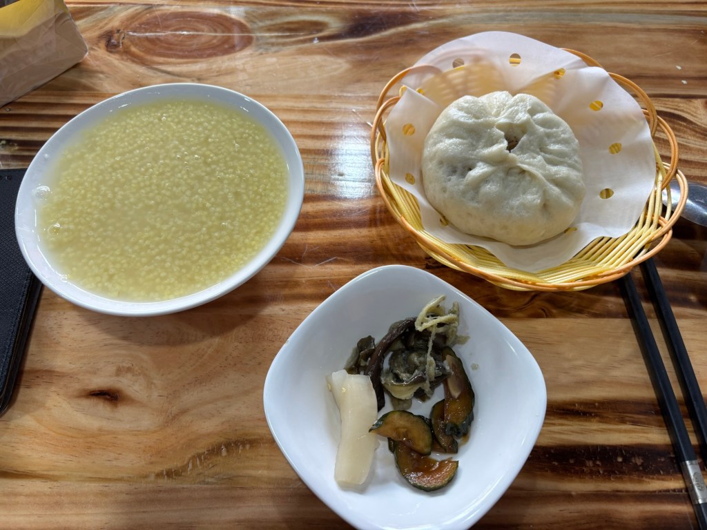 Frühstück gab es nicht in der Pension, aber ich fand ein Baozi Restaurant in der Nähe, das mich für 4 Yuan satt machte. So allmählich gewöhne ich mich an chinesisches Frühstück.