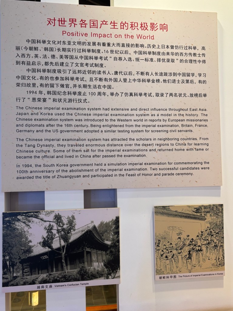 In der großzügigen Anlage der ehemaligen Beamtenbildungsstätte verbrachte ich auch relativ viel Zeit. Vieles der Inhalte dort kannte ich noch aus dem Studium, aber ja, Bildung hat in China seit Jahrtausenden einen sehr hohen Stellenwert. Aufstieg durch Bildung bzw. Beamtenkarriere stand grundsätzlich (fast) jedem männlichen Bürger zur Verfügung – sofern die Familie die Arbeitskraft entbehren konnte. Die allermeisten Infotafeln gab es auch in ganz gutem Englisch, was viel über die Zielgruppe und das Sendungsbewusstsein des Museums aussagt. Eine der Tafeln ging gar soweit zu behaupten, das chinesische Bildungssystem mit der zentralisierten Beamtenprüfung sei über Missionare in den Westen importiert worden. Hier wurde auch explizit Deutschland erwähnt. Allerdings kann ja eigentlich erst ab Reichseinigung 1871 unter Bismarck von Deutschland mit der Möglichkeit sowas wie zentrale Prüfungen durchzuführen, die Rede sein. Ich will einen gewissen Einfluss protestantischer Missionare auf preußische Politik nicht ausschließen, aber ob Chinas Einfluss in diesem Punkt hier wirklich so groß war, bedarf aus meiner Sicht noch weiterer Belege. Hier die Infotafel: