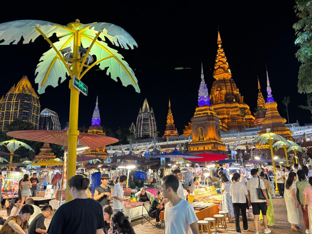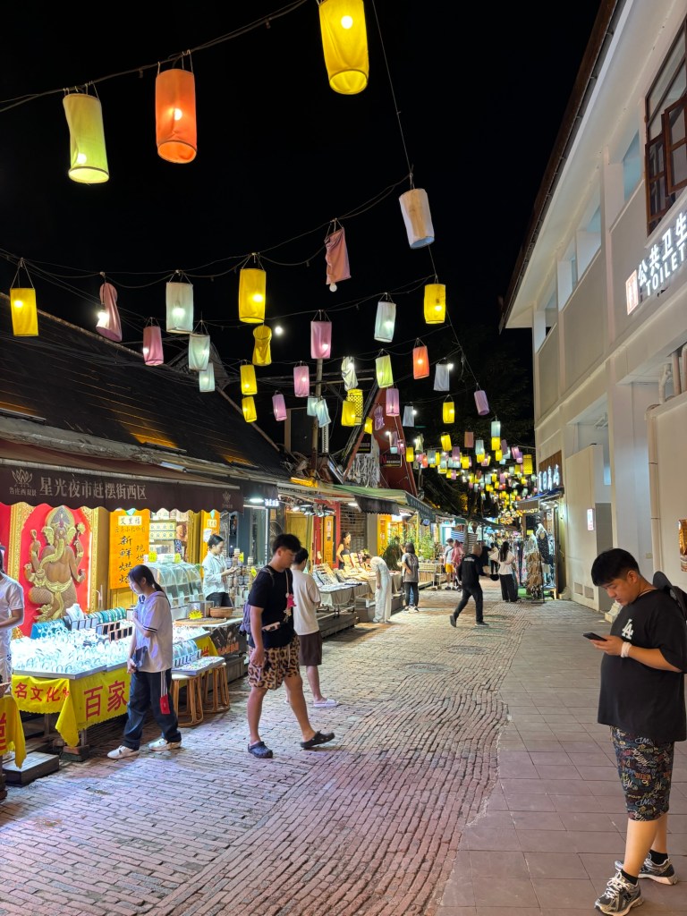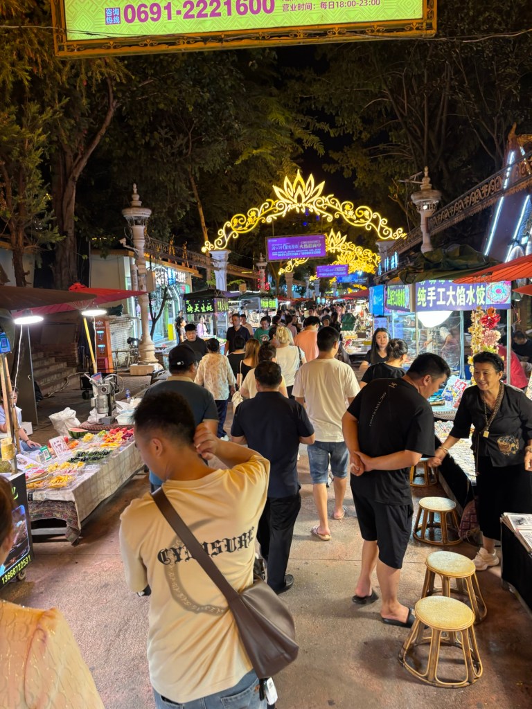 Mein Hotel befand sich praktischerweise nur zwei Minuten Fußweg vom bekannten Gaozhuang Night Market. Praktisch deswegen, weil ich erst gegen 20:00 Uhr im Hotel ankam und um diese Uhrzeit viele Restaurants schon die Bürgersteige hochklappen. Nicht so natürlich der Nachtmarkt, der ja nicht umsonst so heißt. Der Zugang ist kostenlos, doch werden die Menschenmassen über ein Ticketingsystem gehandhabt. Ich musste also scannen und einen Zeitslot auswählen. Das Personal war sehr hilfsbereit und zeigte mir welche Schritte ich auf meinem Handy eingeben musste, um sofort Zugang zu erhalten. Ich betrat den Marktbereich über einen Zugang neben dem beeindruckenden Jinghong Dajin Tasi Tempel (leider aktuell wegen Renovierung geschlossen) und hatte damit gleich zum Start einen Blick von oben auf den erleuchteten Markt und den Mehkong Fluss im Hintergrund. Die Atmosphäre war magisch. Das fanden wohl viele, denn überall drapierten sich Menschen, um Fotos zu machen.