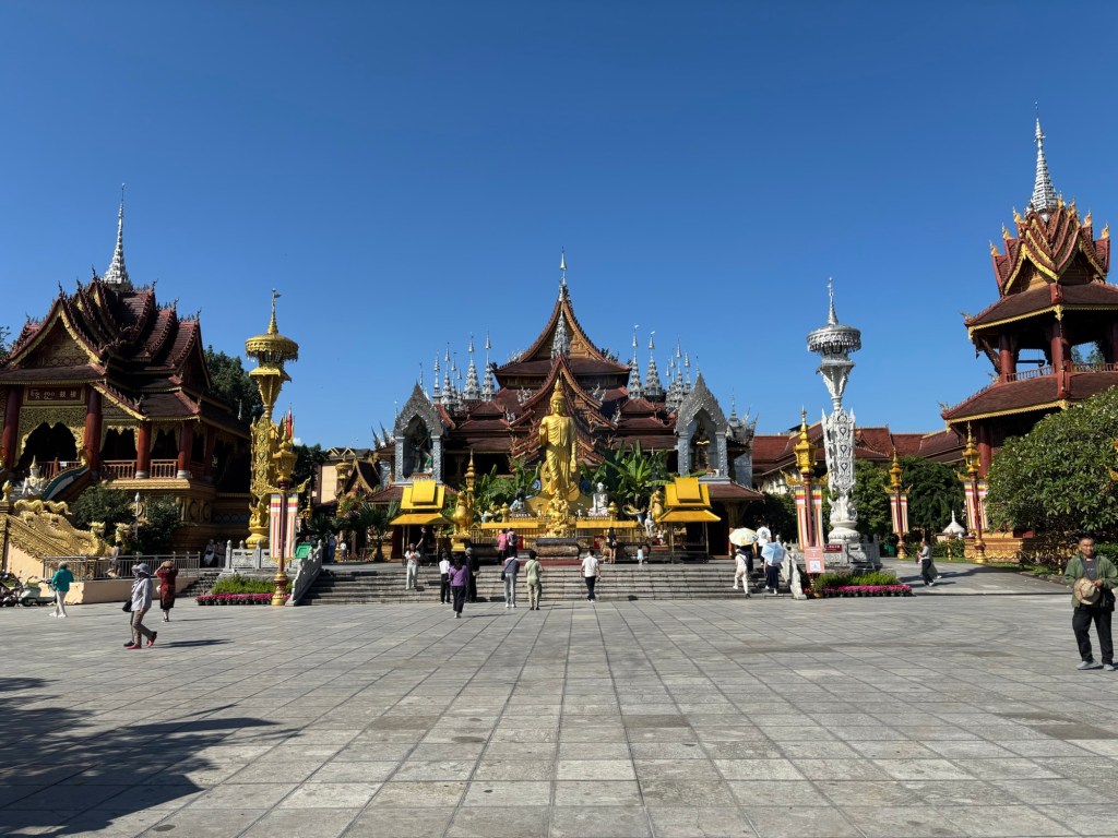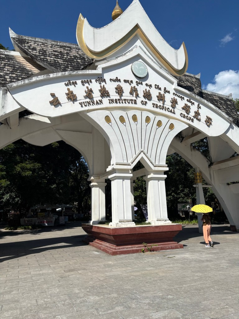 Die Zugfahrt von Kunming liegt bei ca. vier Stunden, also für meinen Geschmack gerade so an der Grenze für einen Wochenendtrip. Die thailändische Grenze ist nah, der Mehkong durchfließt das Gebiet. Es gibt Tee, allerlei Früchte, Tempel, viel gold Verziertes und Frauen in traditionellen bauchfreien Kleidern mit Sari. Hätte ich nicht überall Chinesisch auf der Straße gehört, hätte ich glauben können, ich sei bereits in Thailand.