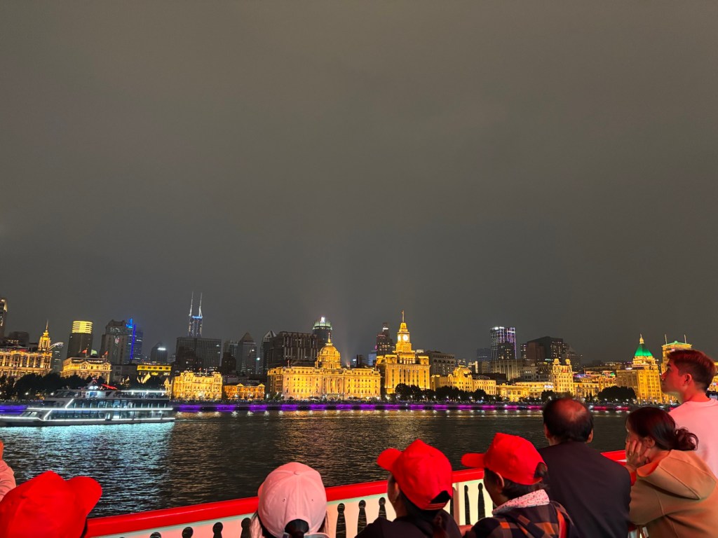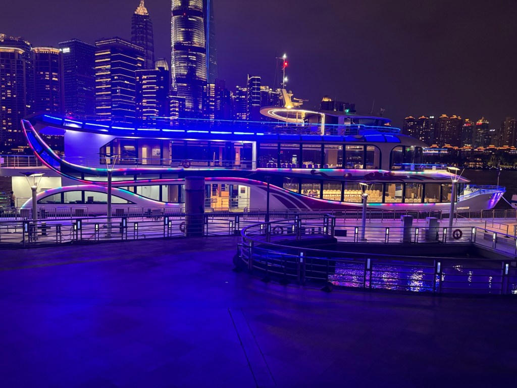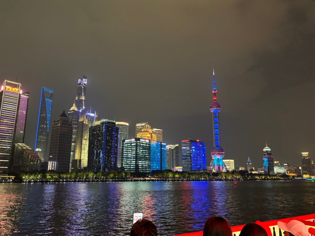 Wir nahmen den Maglev, also die Magnetschwebebahn, in die Stadt, einfach um es einmal gemacht zu haben und von dort aus ein Didi zur Ferienwohnung. Natürlich waren wir ein wenig früh dran zum einchecken, aber wir konnten zumindest unser Gepäck ablegen und davon erleichtert ein wenig die Umgebung erkunden. Wir fanden einen Park, Tee und einen Gemüsemarkt. Gute erste Eindrücke für Jonas. Mittags konnten wir unsere Wohnung beziehen und abends wagten wir uns noch einmal raus für eine Bootstour auf dem Huangpu Fluss mit Blick auf die angestrahlten britischen Häuser des Bund und der glitzernden Hochhausfassaden von Pudong.