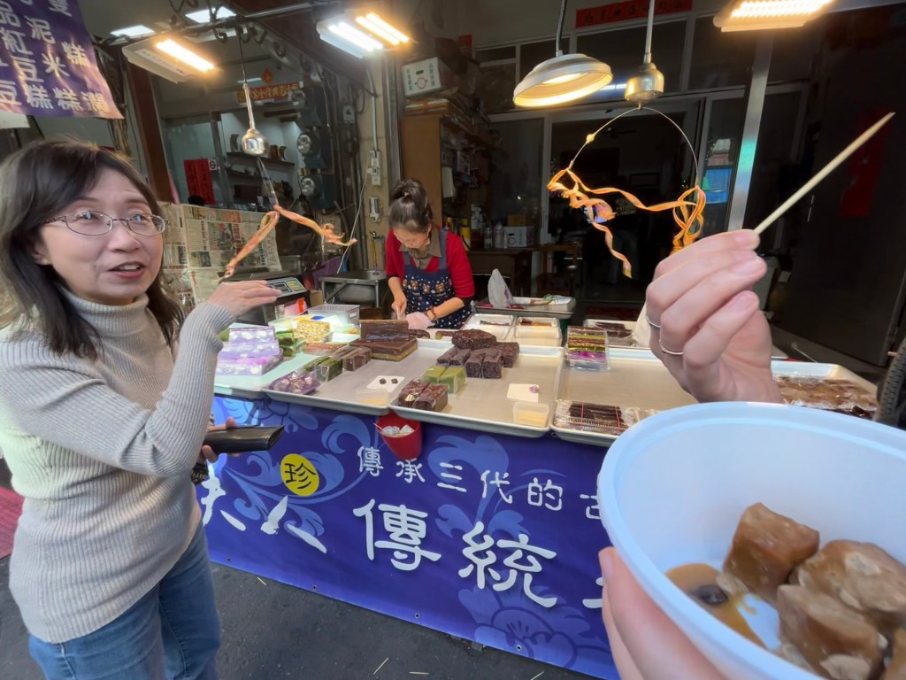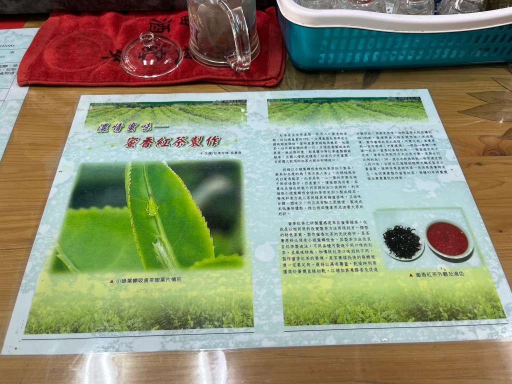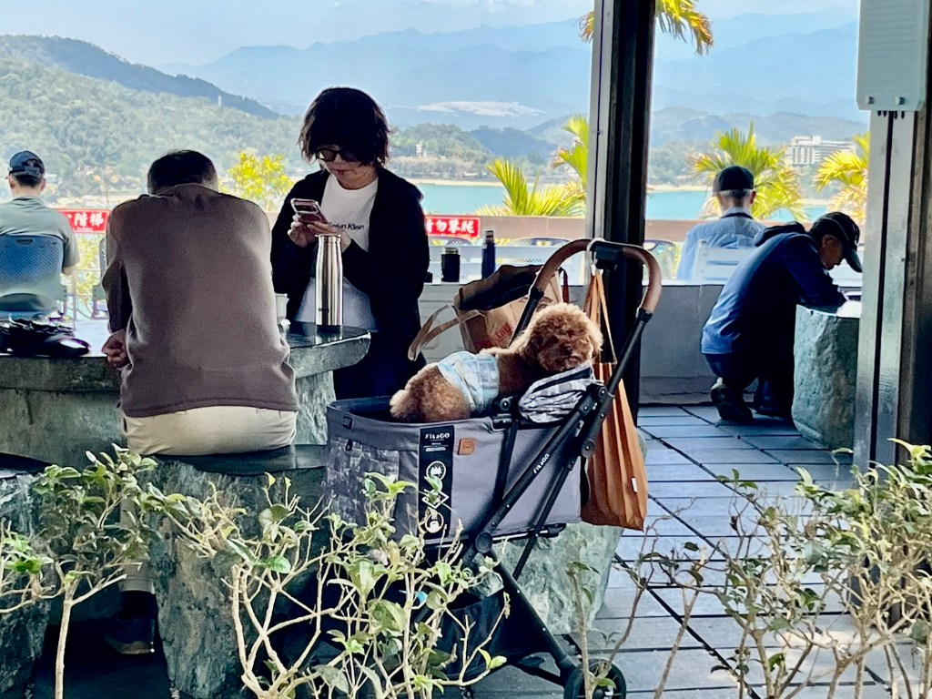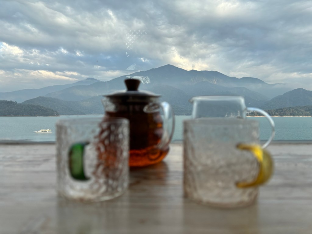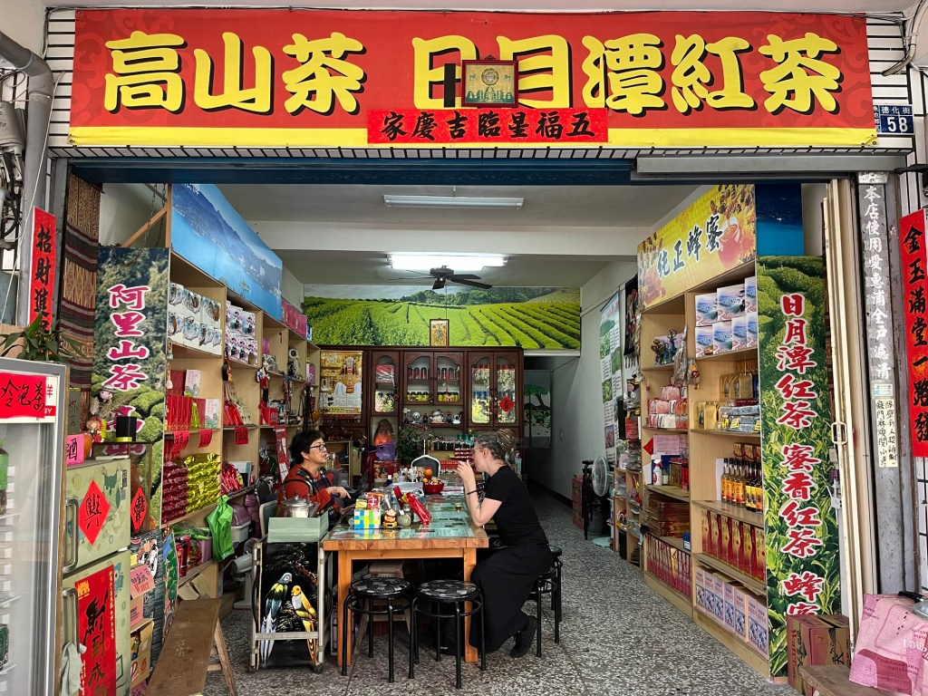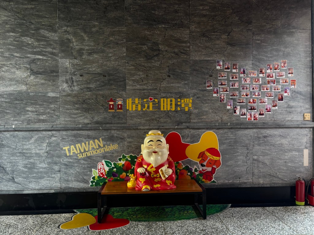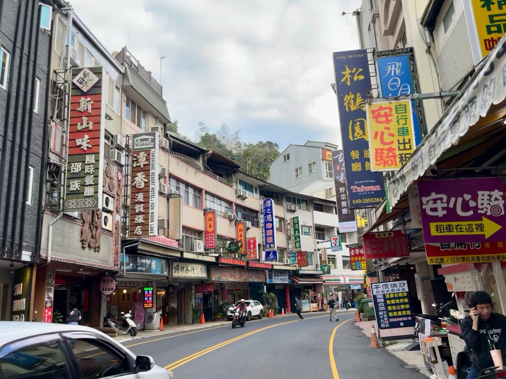 Wir checkten im Hotel ein und zahlten Zimmer mit Frühstück im Voraus. Zu meiner Freude trafen wir neben den sehr freundlichen Gastgeberinnen auch eine fette Katze an, die sich leider aber nicht streicheln ließ. Ich versuchte wirklich sehr konzentriert nicht sofort einzuschlafen, also machten wir uns auf, eine Runde durchs Dörfchen und zum See drehen. Ich lernte, das Shuishe das Dörfchen ist, das touristisch am meisten angefahren wird am See. Im Wesentlichen gibt es zwei Straßen, die in erster Linie aus Geschäften für Nippes und/oder Tee, Fahrradverleihen, Hotels und Restaurants bestehen. Oh, und 7/11. Wichtig: eine Bank gibt es nicht und Bargeld holen bei 7/11 kostet – zumindest für meine Kreditkarten – 100 NTD. Ich versuchte es beim Geldautomaten der Post, war aber nicht erfolgreich. Also: genug Bargeld mitnehmen oder 3 EUR Gebühr in Kauf nehmen.