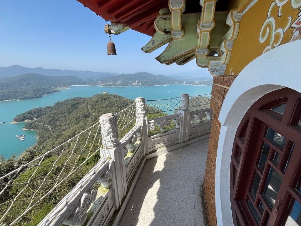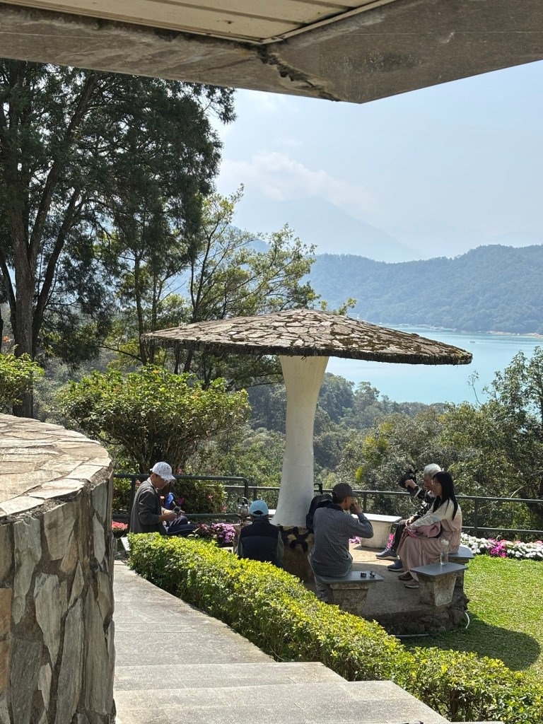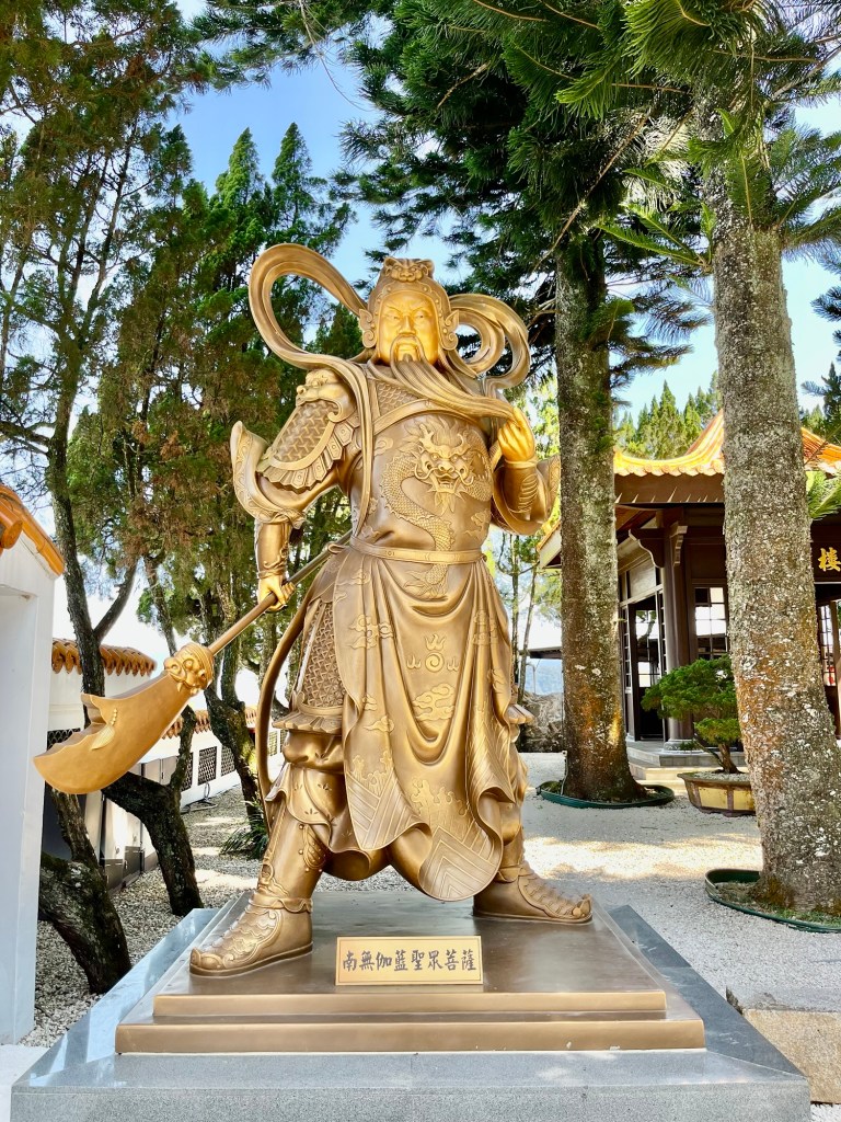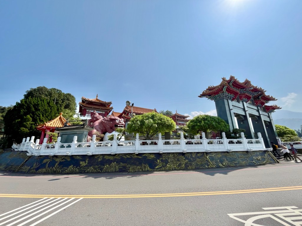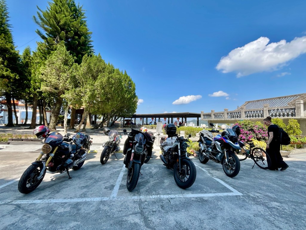 Dahinter begann ein Fußweg durch den Djungel, ca. 800 Meter bergauf zum deutlich größeren Xuan Zang Tempel. Hier werden die Gebeine des buddhistischen Gelehrten Xuan Zang verehrt. Der Mönch hatte in der Tang Dynastie Indien bereist, um die reine buddhistische Lehre zurück nach China zu bringen. Seine Gebeine gelangten in japanische Hände und wurden von Chiang Kai Shek – zumindest in Teilen – „zurückgeholt“, so dass sie jetzt einen Ruheort am Sun Moon Lake in Taiwan gefunden haben. Am Tempel begegneten wir außerdem einer Gruppe Motorradfahrender, die uns noch einmal bestätigten, dass es für Ausländer*innen in Taiwan nicht möglich ist, große Maschinen zu mieten. Wir bräuchten Freunde in Taiwan, die uns helfen, also im Klartext Maschinen für uns kaufen und zur Verfügung stellen. Mit einem aus der Crew ist Michael jetzt aber über Instagram verknüpft.