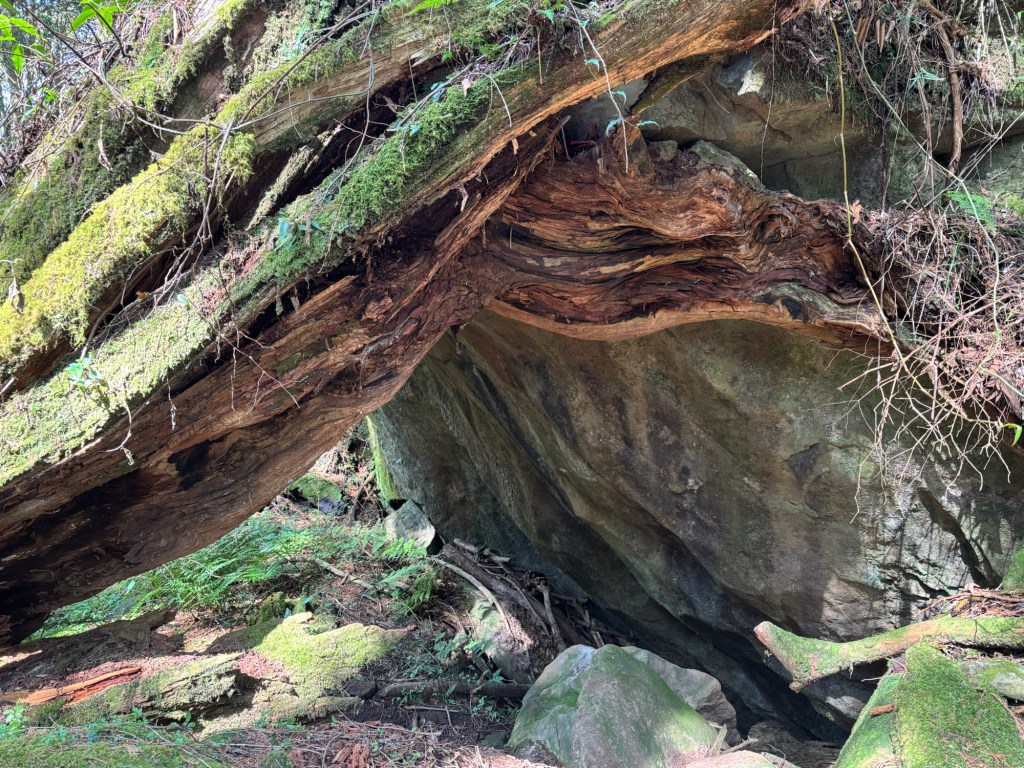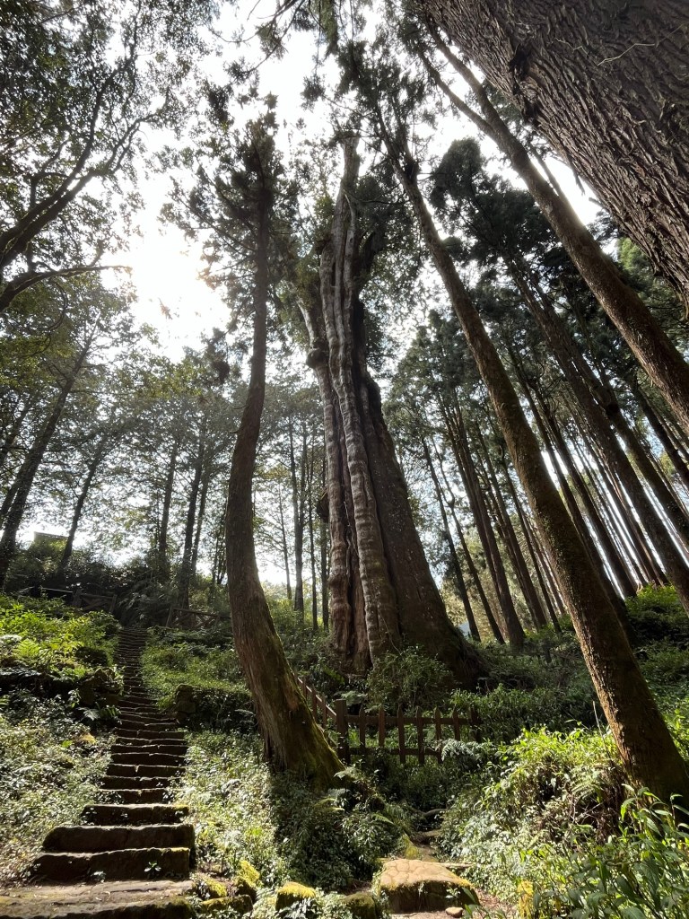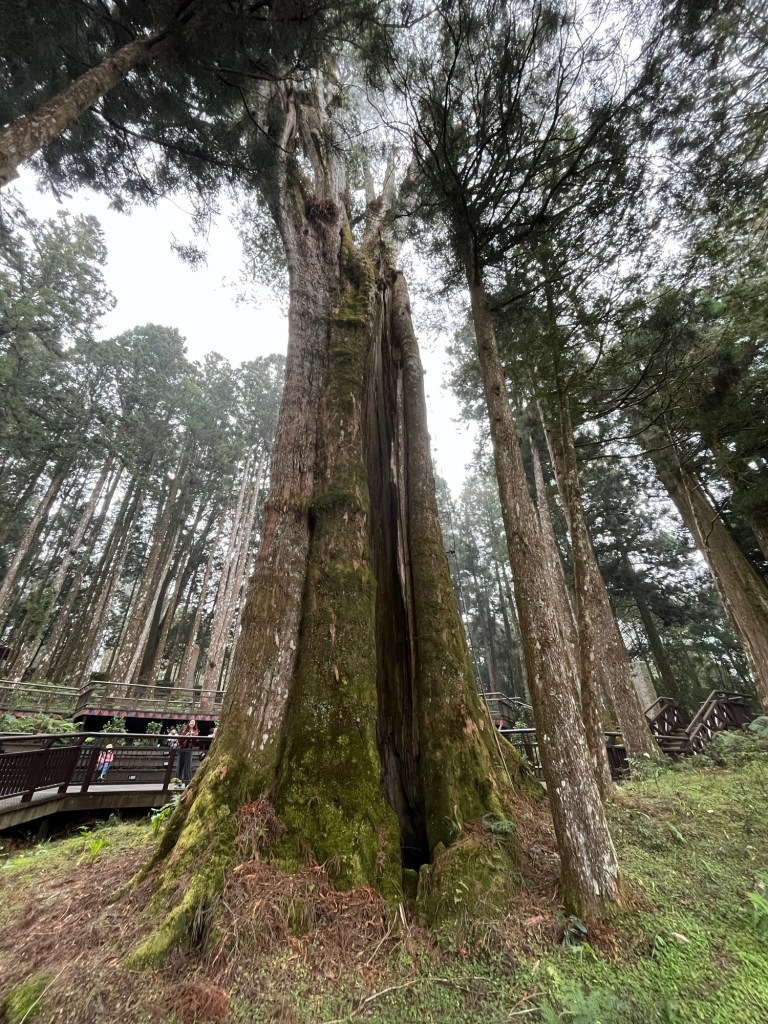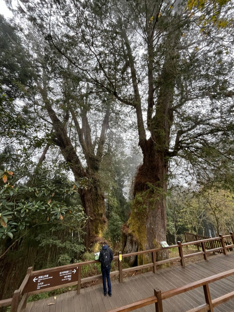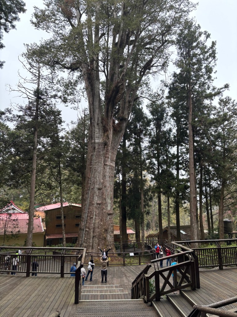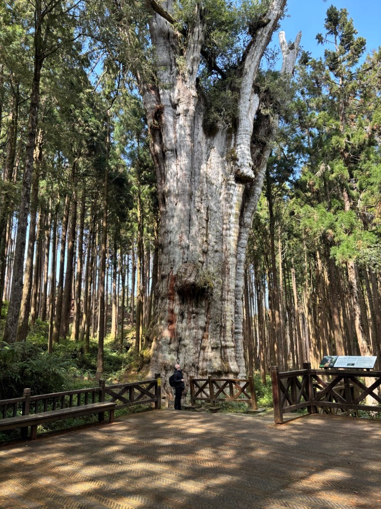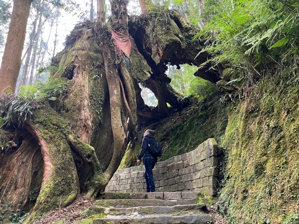 Wir folgten dem Tipp unseres Gastgebers, sonderten uns von der Herde ab und gingen den „Shuishan Healing Path“ entlang. Nach einem kurzen Stück Straße tauchten wir in einen wunderschönen Waldweg ein. Höhepunkt des Weges war ein tausendjähriger, riesiger Baum, bzw. präziser eine Verschmelzung mehrerer Bäume zu einer großen Einheit. Zurück führte uns der Weg auf einem alten, nicht mehr regelhaft benutztem Gleisbett entlang.
