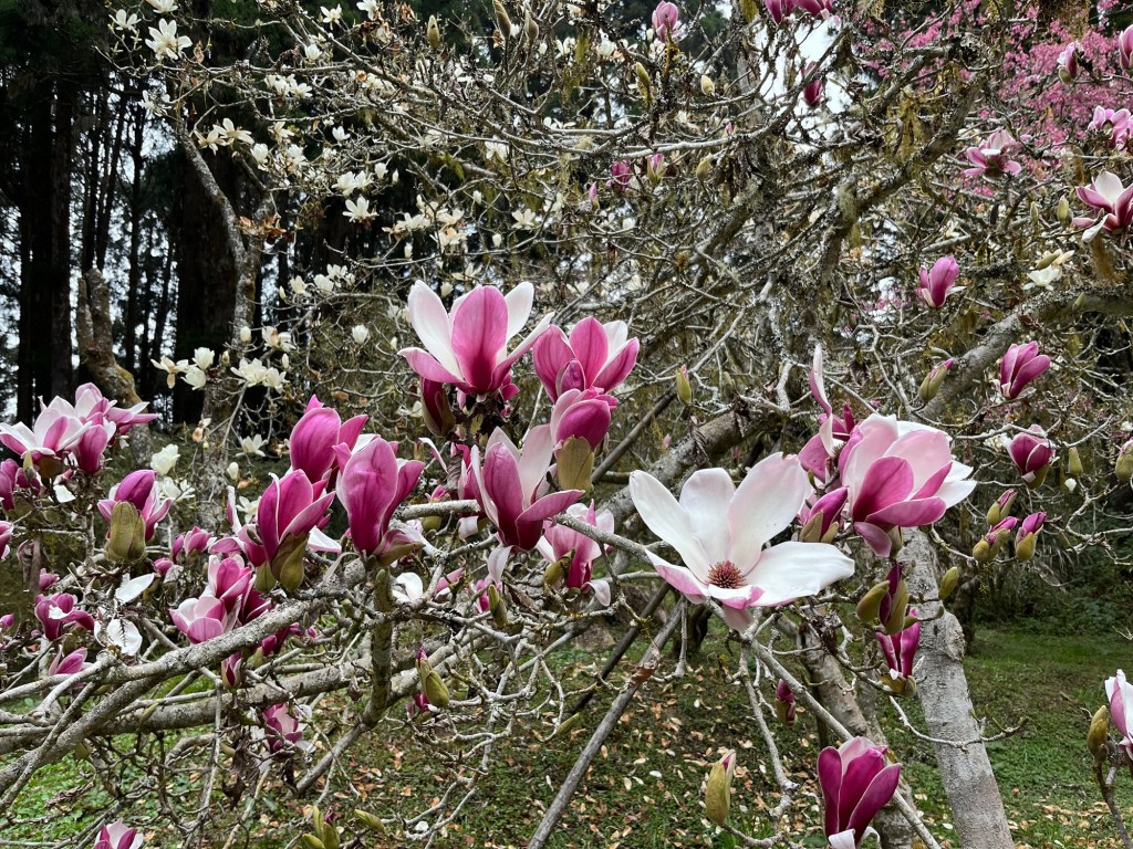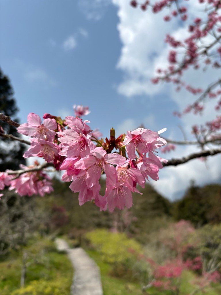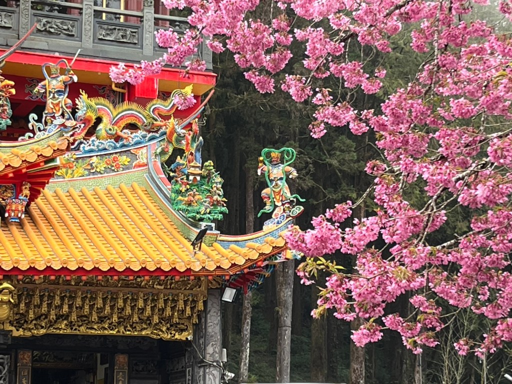 Wir erleichterten unsere Rucksäcke um einige der Snacks und liefen dann an blühenden Kirschbäumen vorbei zu den Sisters Ponds und kamen schließlich am Shouzhen Tempel heraus. In der Xiangling Service Area direkt daneben bekamen wir vegetarisches, warmes essen und frischen Kaffee.