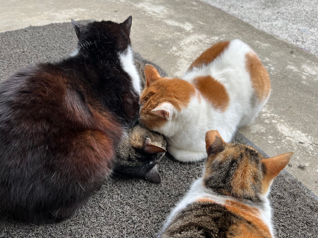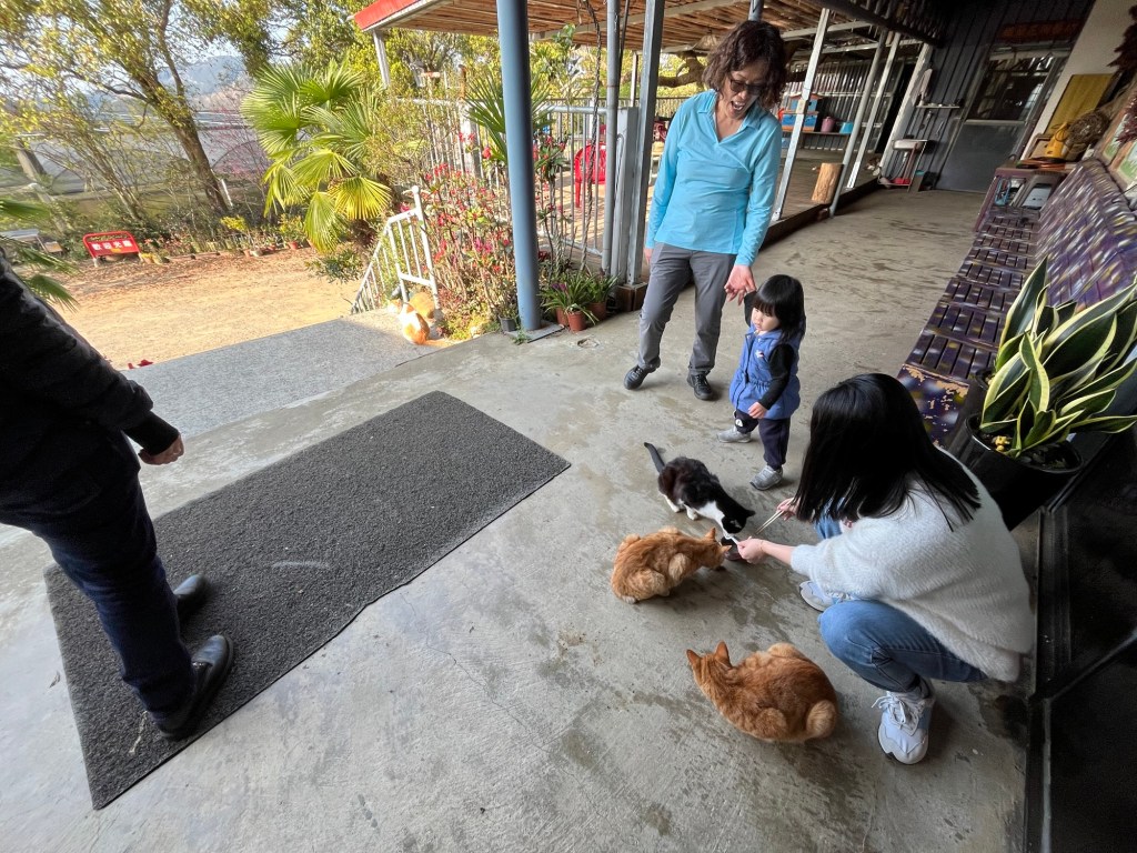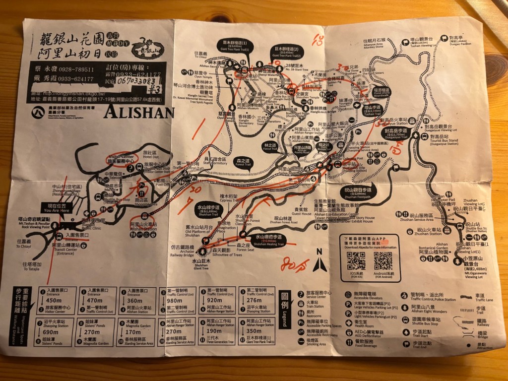 Wir kamen aber heil an unserer Unterkunft an und wurden sogleich von einem ganzen Rudel draußen lebender Katzen begrüßt. Der freundliche Gastgeber gab uns / mir zudem eine ausführliche Erklärung zum Alishan Park, den besten Routen und ungefähren Wegzeiten. Das zeichnete er freundlicherweise alles in einer Karte ein, die er uns mitgab. Sehr hilfreich.